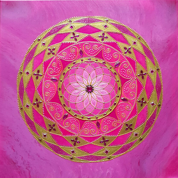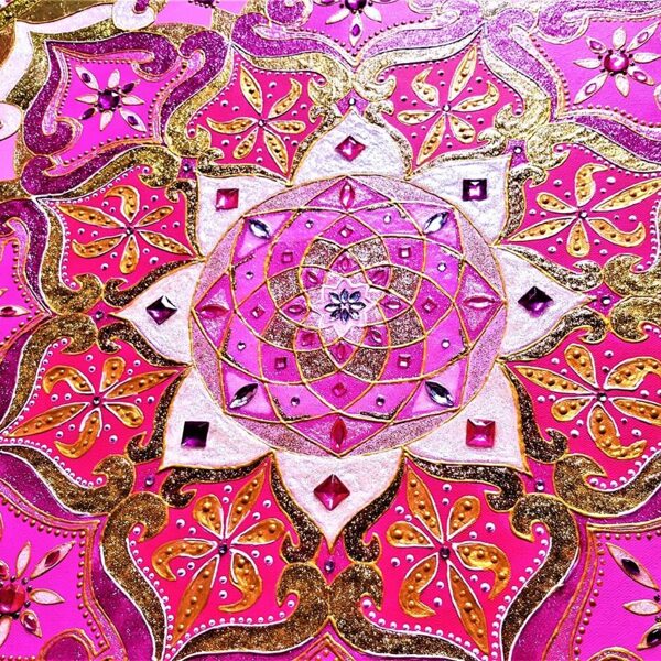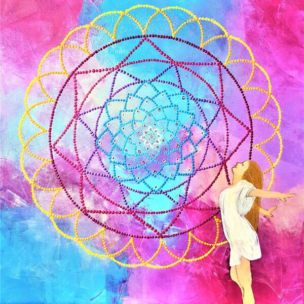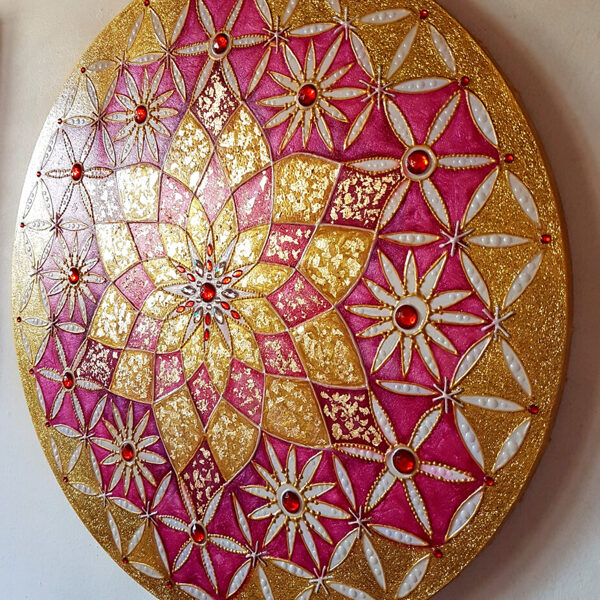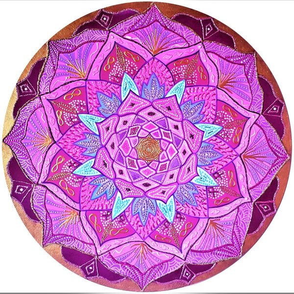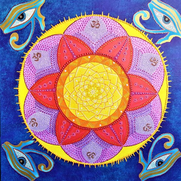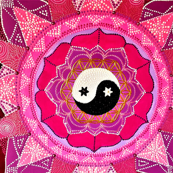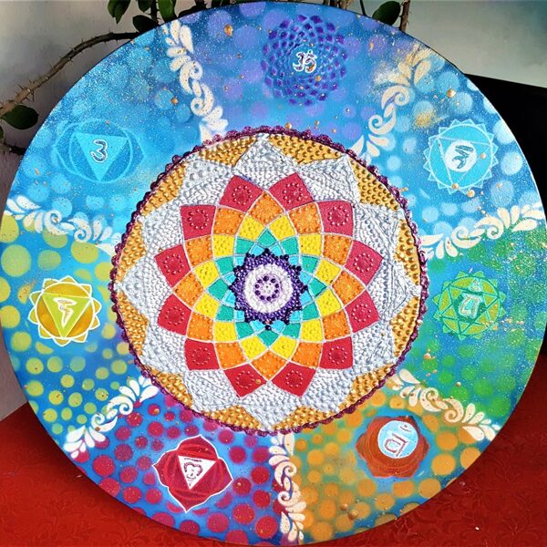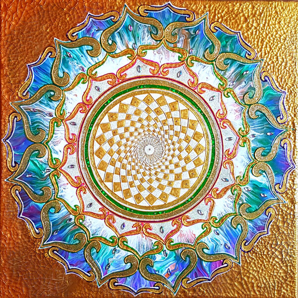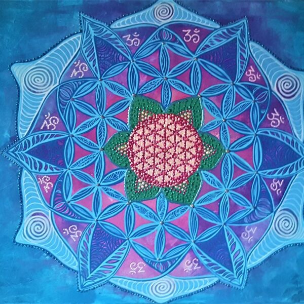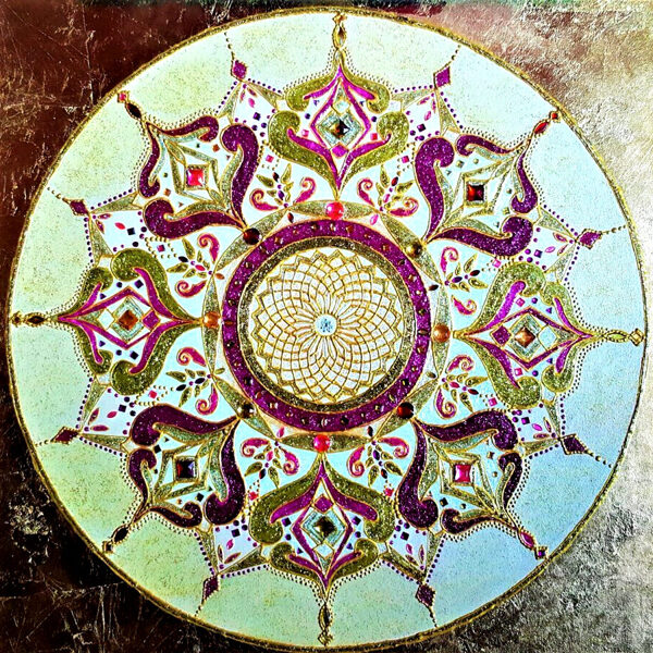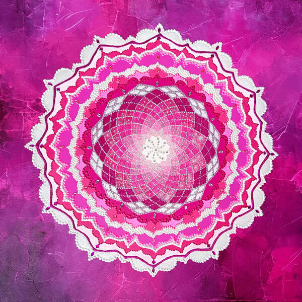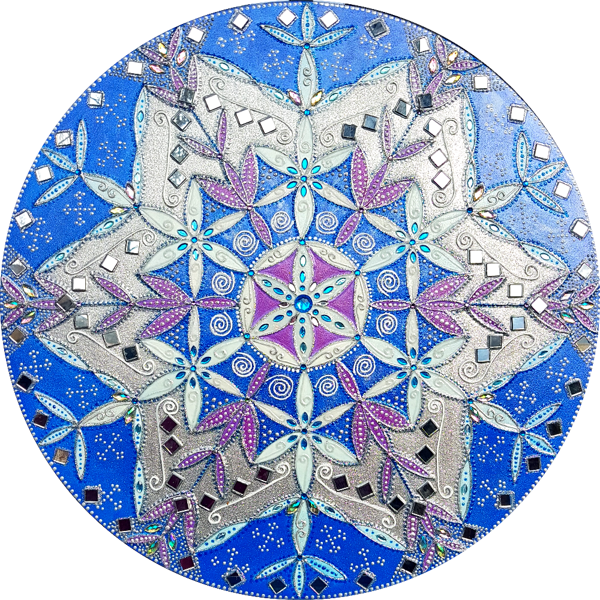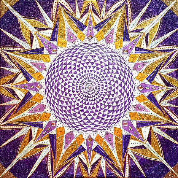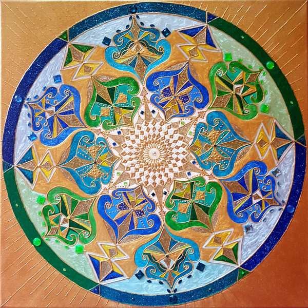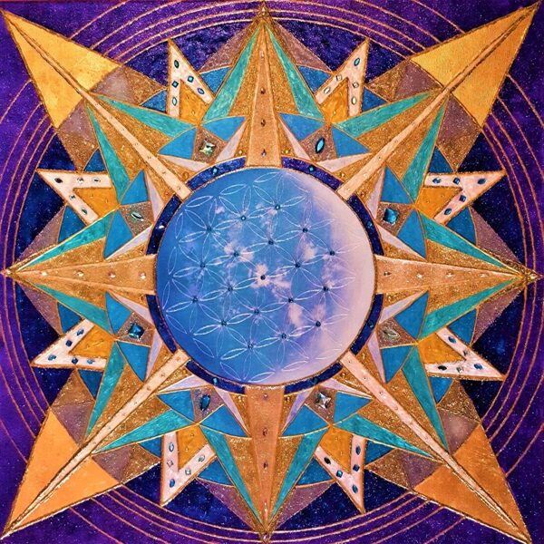 Mandalas lift the energy in spaces and in people through structures that bring clarity. A sense of well-being is created. They counteract disturbances in the spatial field and dissolve "energetic pollution," resulting in an empowering and harmonizing effect. As a meditation tool, mandalas strengthen mental strength and stimulate personal development. They support the attainment of a state of mindfulness and transcendence, improving the flow of mental, emotional, and physical energy. Mandalas are gateways for light and positive impressions from cosmic healing sources. They convey balance, harmony, spiritual presence, clarity, and centeredness as a counterbalance to our turbulent times.